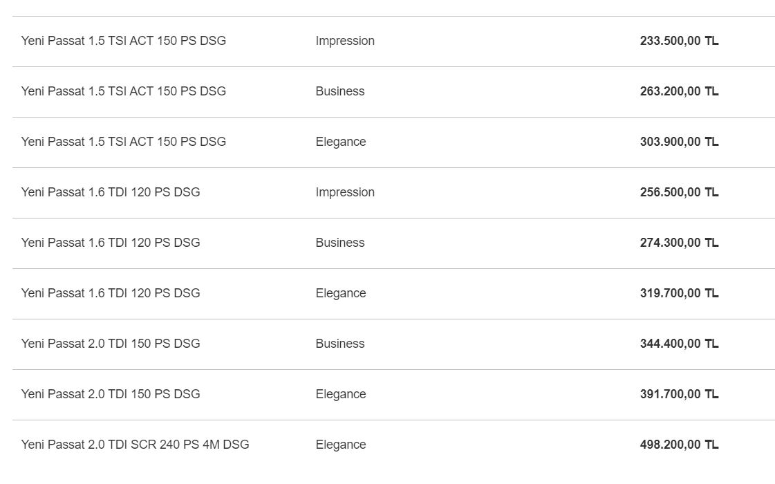 Yeni Passat Türkiye’de sırasıyla Impression, Business ve Elegance olmak üzere üç farklı donanım seviyesinde tercih edilebiliyor. Üç farklı donanım seviyesinde de alınabilen DSG şanzımana sahip 1,5 lt TSI ACT 150 PS benzinli seçeneğin yanı sıra, yine üç donanım seviyesinde de sunulan DSG şanzımana sahip 1.6 lt TDI 120PS dizel seçeneğine de bulunuyor. Yeni Passat ayrıca, Business ve Elegance donanımlarıyla alınabilen 2.0 lt TDI 150 PS ve sadece Elegance donanımla sunulan 2 lt TDI SCR 240 PS 4Motion seçeneğine de sahip.